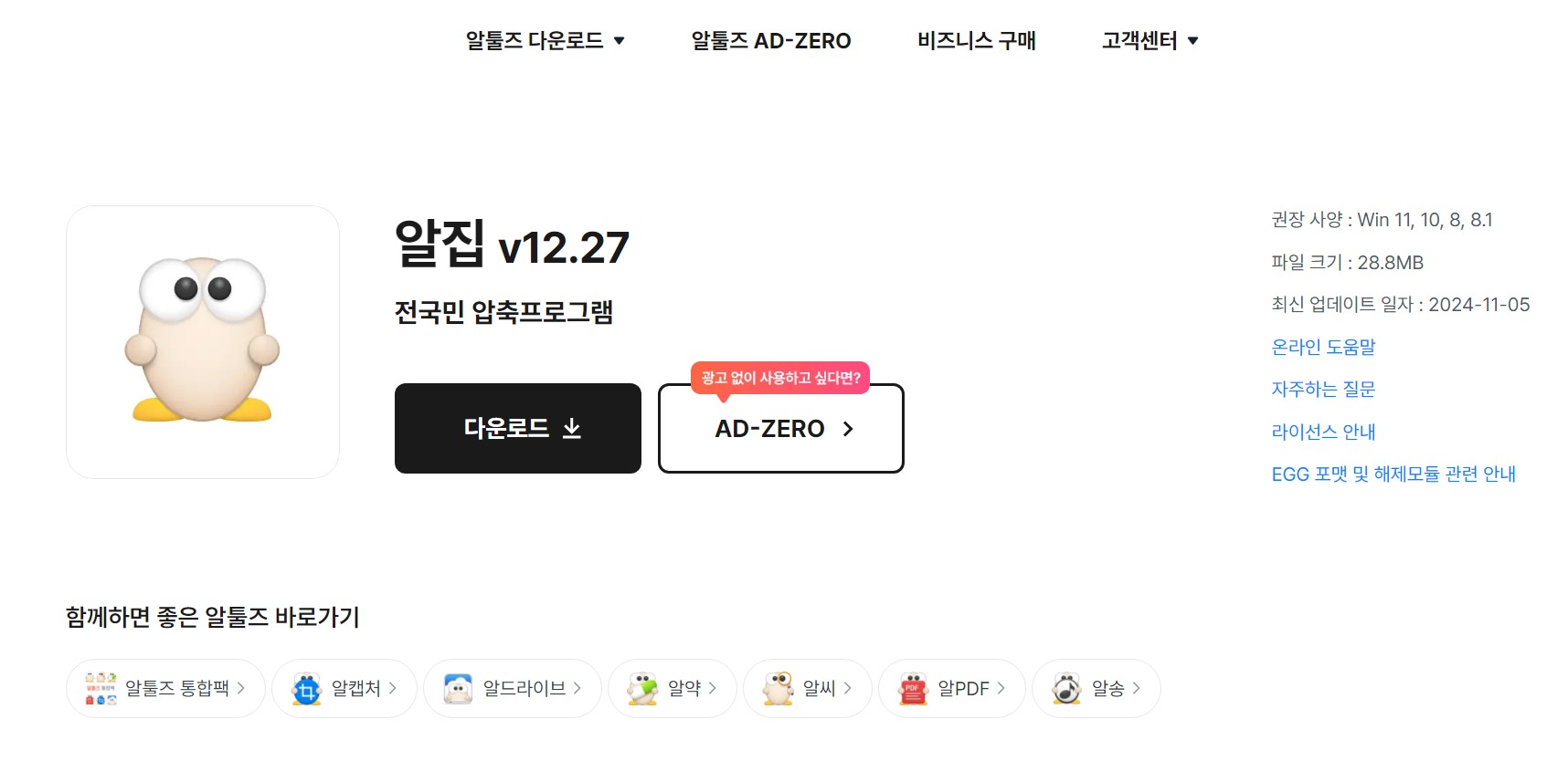 - 웹사이트 상단 메뉴에서 알집을 선택합니다.