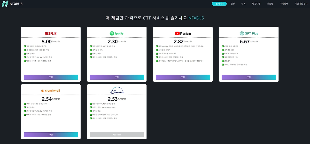 NFXBUS는 넷플릭스와 유튜브 프리미엄을 합리적인 가격에 제공하는 플랫폼으로, 개별 계정을 제공하여 보다 저렴하게 서비스를 이용할 수 있도록 돕는 곳입니다.