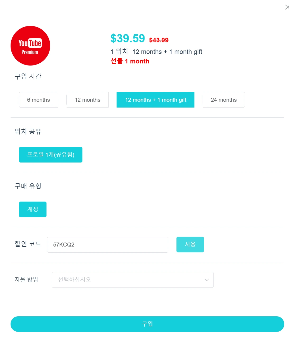 - 12개월 + 1개월 무료: $43.99 → 할인코드 적용 시 $39.59