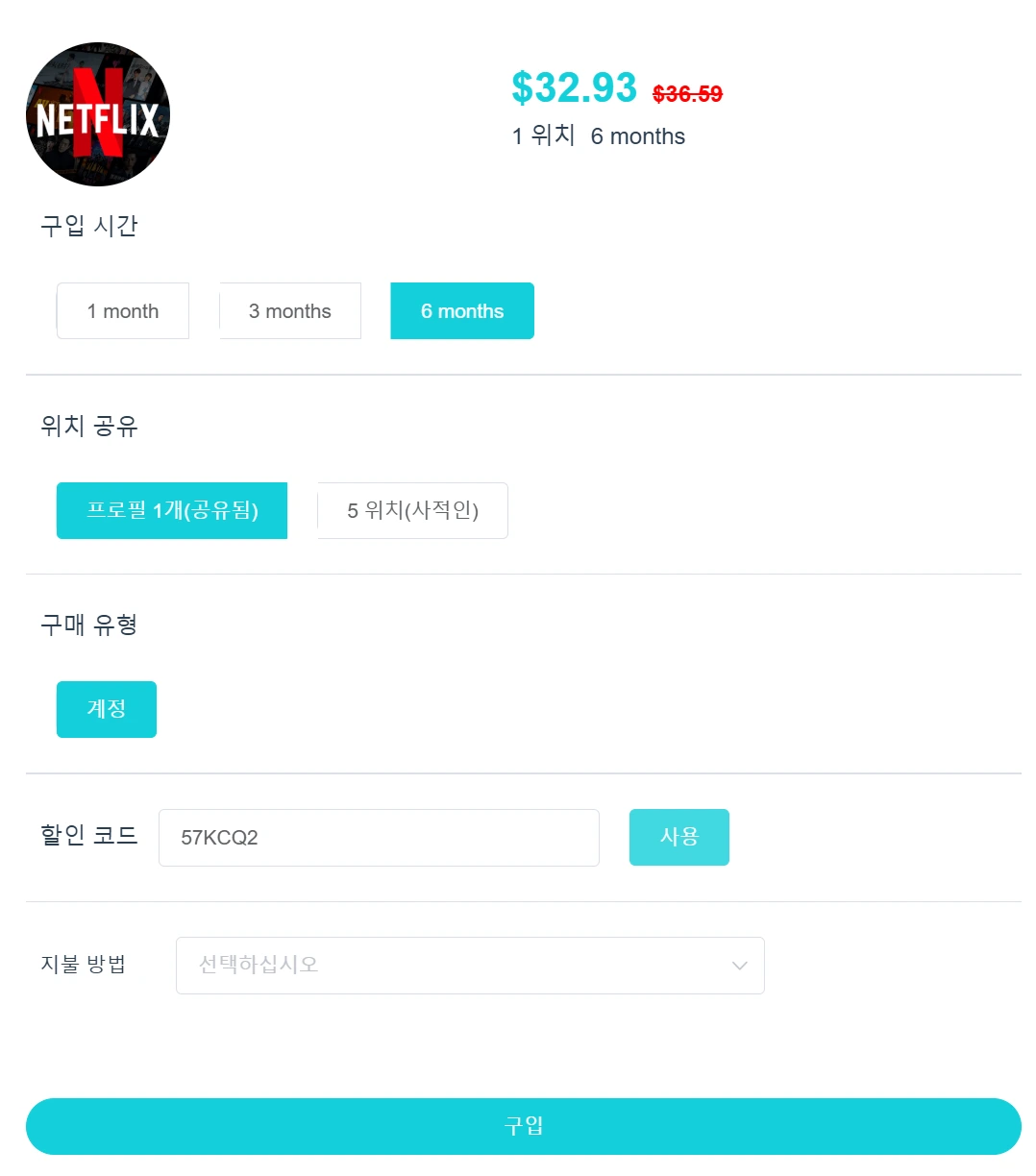 - 6개월: $36.59 → 할인코드 적용 시 $32.93