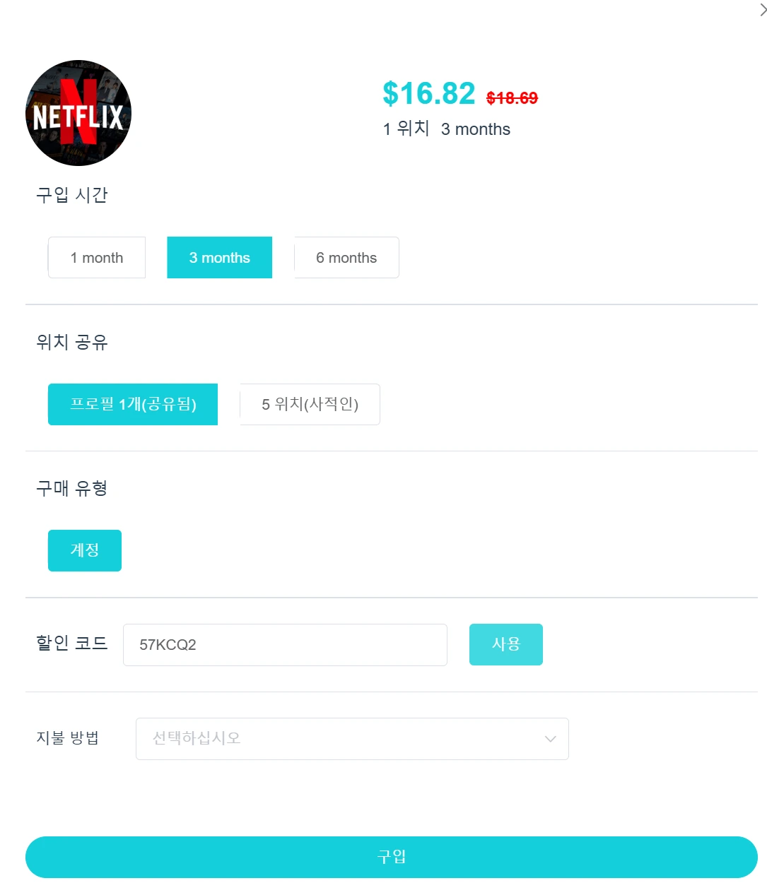- 3개월: $18.69 → 할인코드 적용 시 $16.82