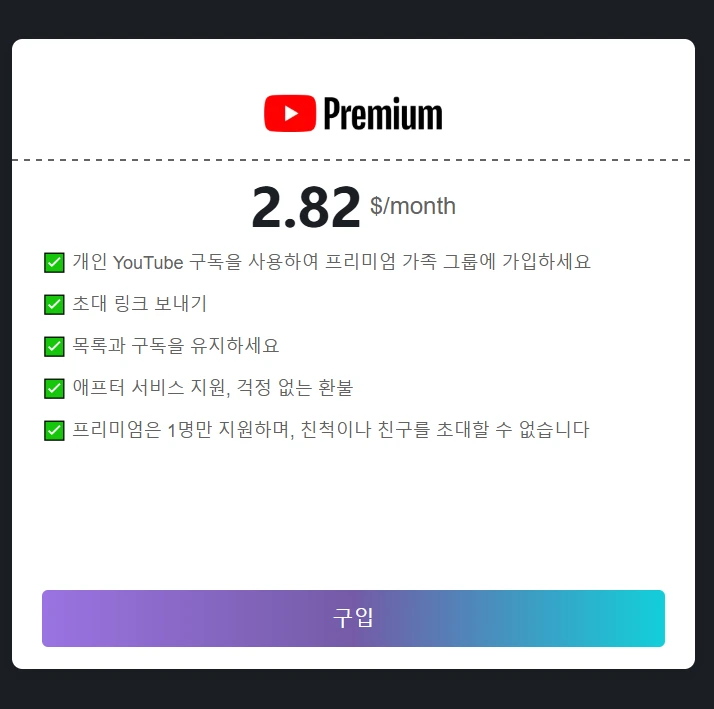 NFXBUS 덕분에 저는 유튜브 프리미엄을 월 $2.82(약 3,700원)에 이용 중입니다. 광고 없이 편안하게 영상을 시청할 수 있어서 매우 만족스럽습니다.