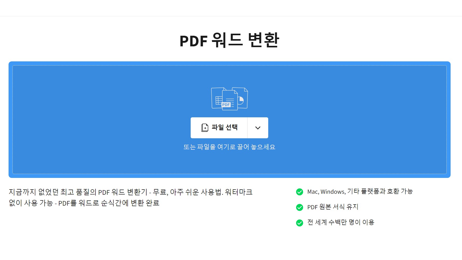 - 한글 지원 가능(Word로 변환 후 한컴오피스에서 HWP 저장).